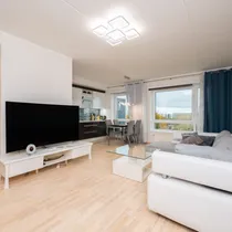 The spacious living room is connected to the kitchen and has access to a balcony, where you can enjoy a beautiful view during warm weather.