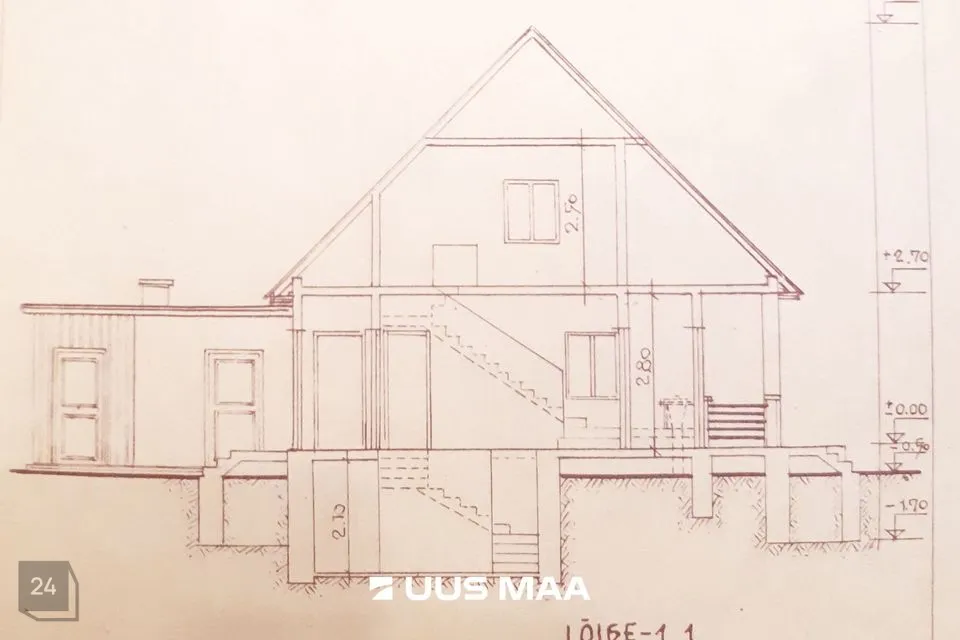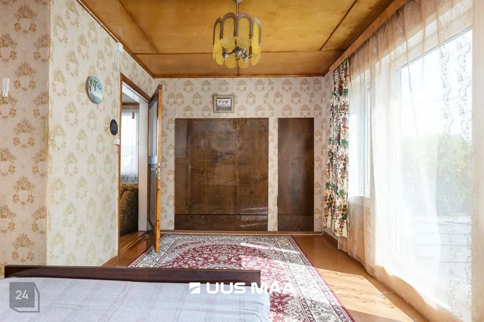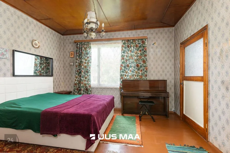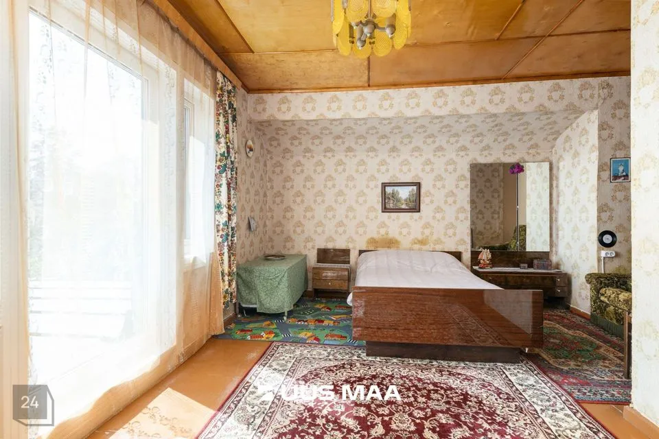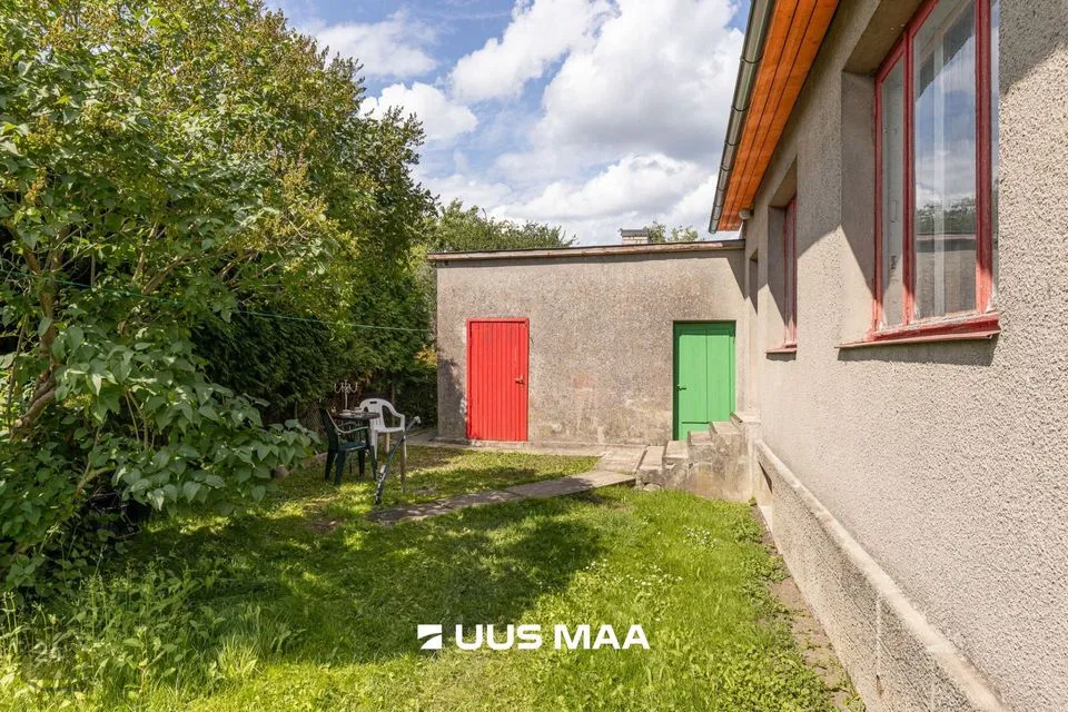 • Ground floor contains a large living room, veranda room with separate entrance, bedroom, kitchen with yard exit, vestibule and dry WC. Additionally, in the unfinished part: garage, laundry/bathroom and shed. Second floor has 2 bedrooms, one of which is a passage room. Basement floor has storage room.