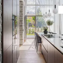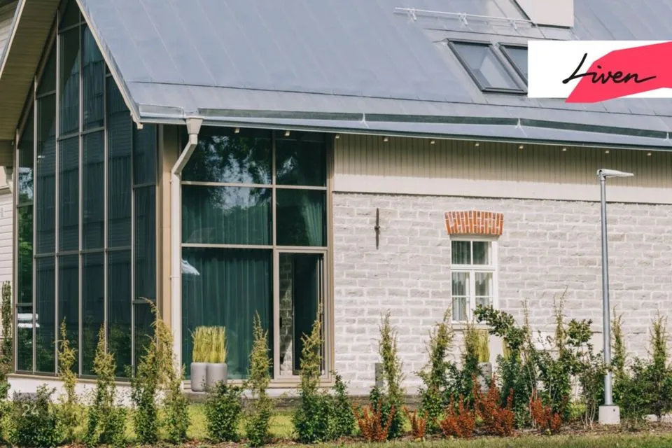 Baroni house is a very special detached house with six rooms, a sauna, and a terrace, where the kitchen-dining room glass facade is an impressive six meters high. The interior of the house is characterized by the keyword "modern urban house" and its focus is on the limestone-covered wall between the glass-facade dining and living rooms.