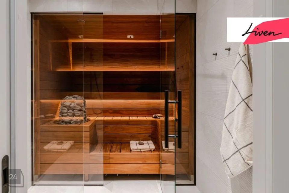 This home features a cozy sauna with a glass-walled steam room, with paneling and sauna benches in a dark gray finish, treated with SUP sauna wax. The Estonian design heater Huum Hive provides warmth and beautifies the steam room.
