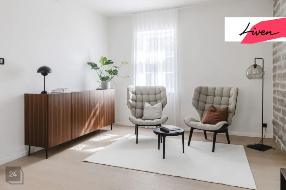 Baroni house features wide single-strip light oak parquet, with warm white tones used on the walls. The 2.3-meter high profile doors have hidden hinges and magnetic locks, in the same color as the wall. The ceramic tile selection is grayish-beige to further emphasize the light warm parquet. A wooden staircase leads to the second floor. Details are black or anthracite gray, with VAL75 door handles designed by Estonian designer Aap Piho, matching the anthracite gray sockets and switches in a matte black series. Recessed lighting also has black edges.