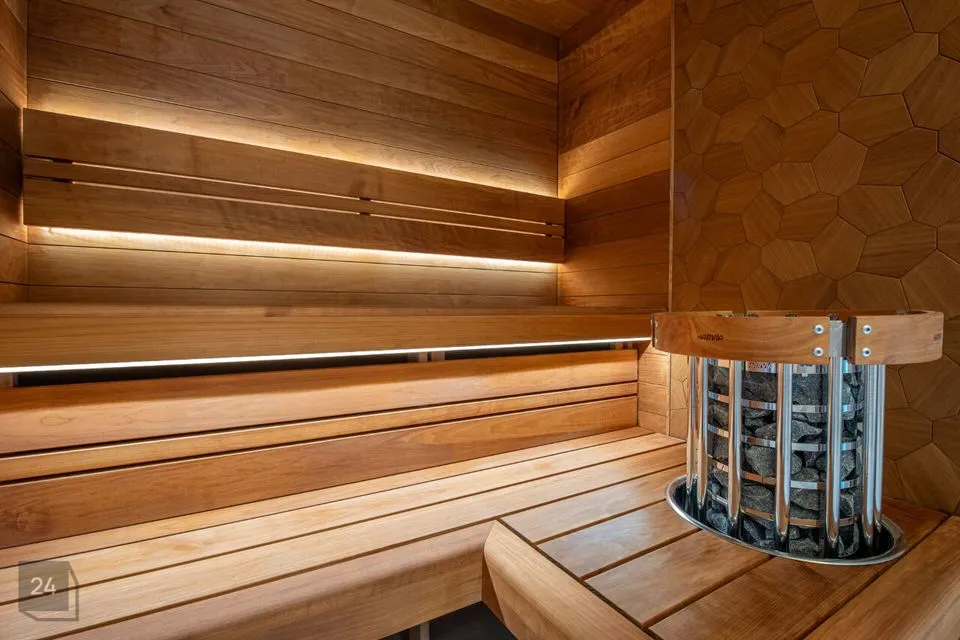 The turnkey price includes the finished home: flooring, plumbing (sinks, faucets, etc.), thermowood and a sauna with a Harvia heater and painted interior surfaces.