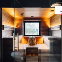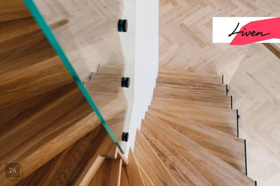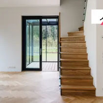 – herringbone pattern and natural finish oak parquet – wall color recesses – matte stainless steel door handles – matt white switches, sockets, and recessed lighting – 60x60 cm ceramic tiles in bathrooms, Grohe chrome-finished mixers, Villeroy & Boch sink and toilet, Balteco acrylic bathtub, bath glass – Huum Hive Mini heater in the sauna, overplated floor drain, shower glass – glazed terrace – air conditioning in the living room and second floor stairwell