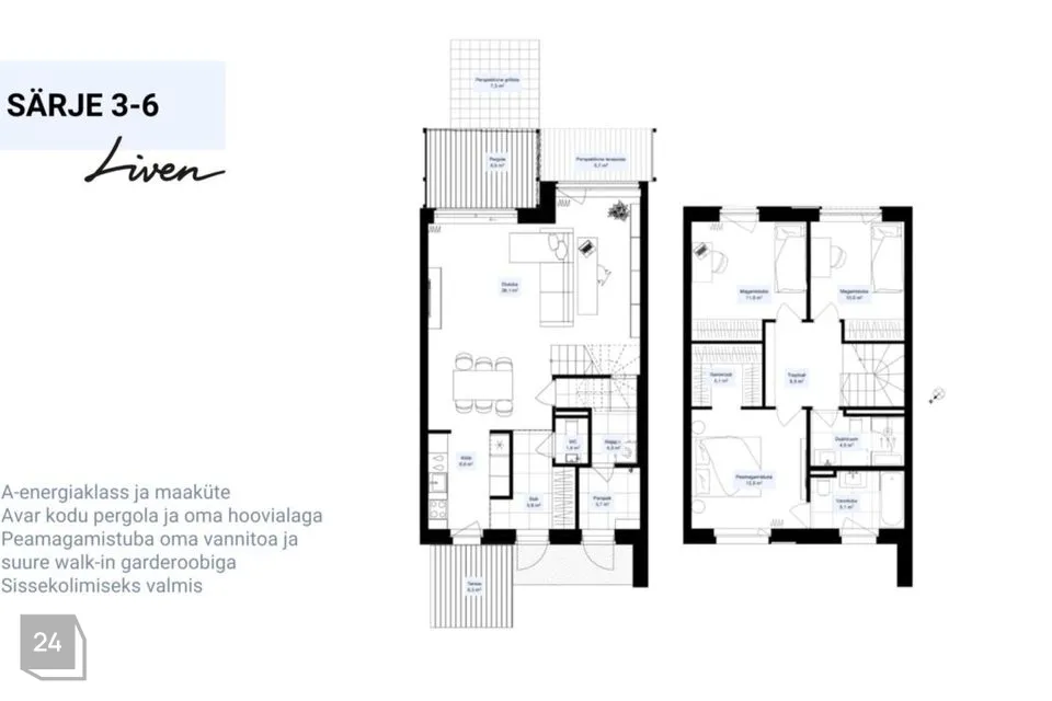 A spacious 4-room home with high ceilings, where the first floor features a large living room, kitchen, separate toilet, utility room, and a practical storage area accessible from both the room and outside. Additionally, there are pleasant terrace and pergola to extend living spaces during summer. The second floor houses three bedrooms, two bathrooms, and a spacious walk-in closet. Two parking spaces are included with the property.