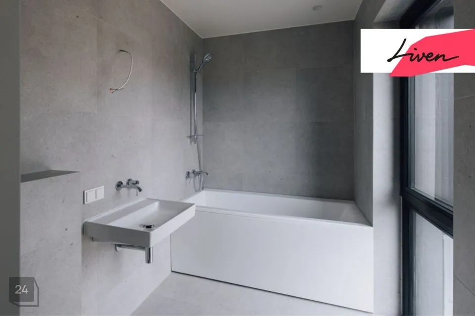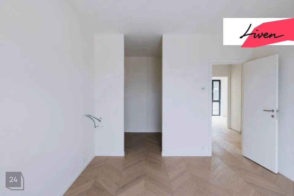– Light oak parquet with French herringbone pattern – Matte stainless steel door handles – Matt white switches, sockets, and recessed lighting – Light gray 60x60 cm wall and floor tiles – Grohe chrome-finished mixers, Villeroy & Boch sinks and toilets