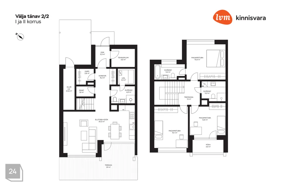 Esimesel korrusel on elutuba kööginišiga, saun, panipaik, garderoob, tehnoruum, kuur. Esimese korruse avarale terrassile pääseb elutoast.