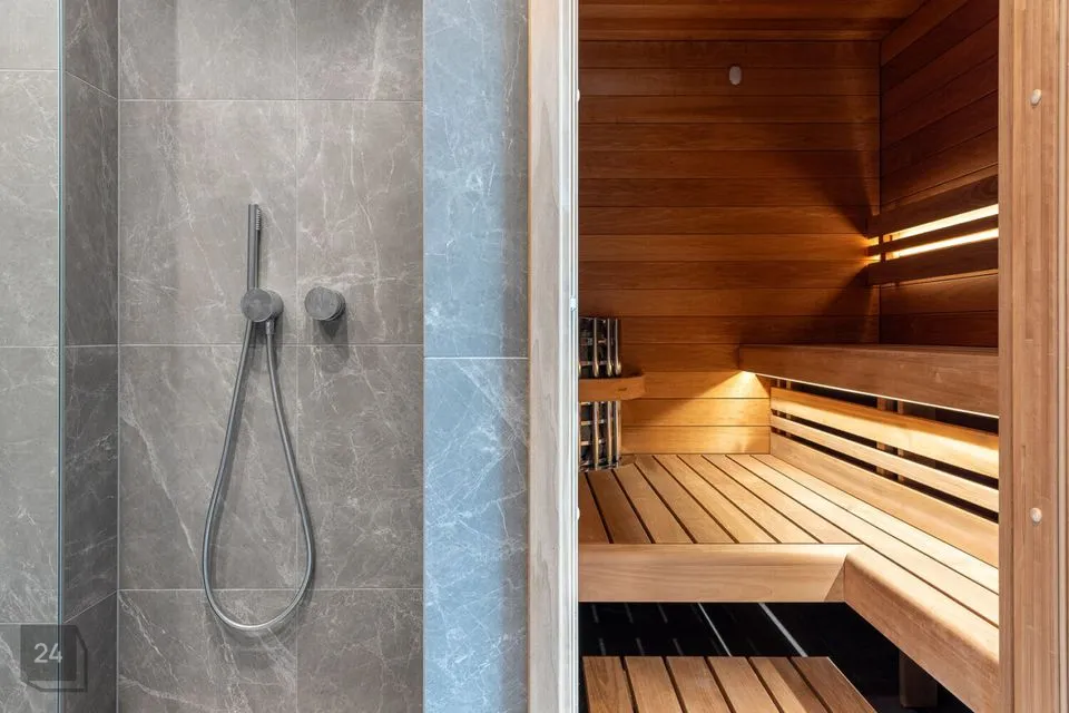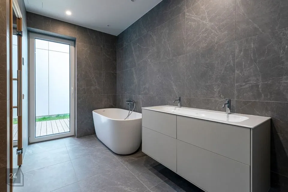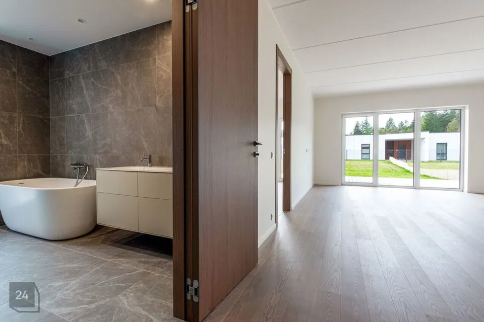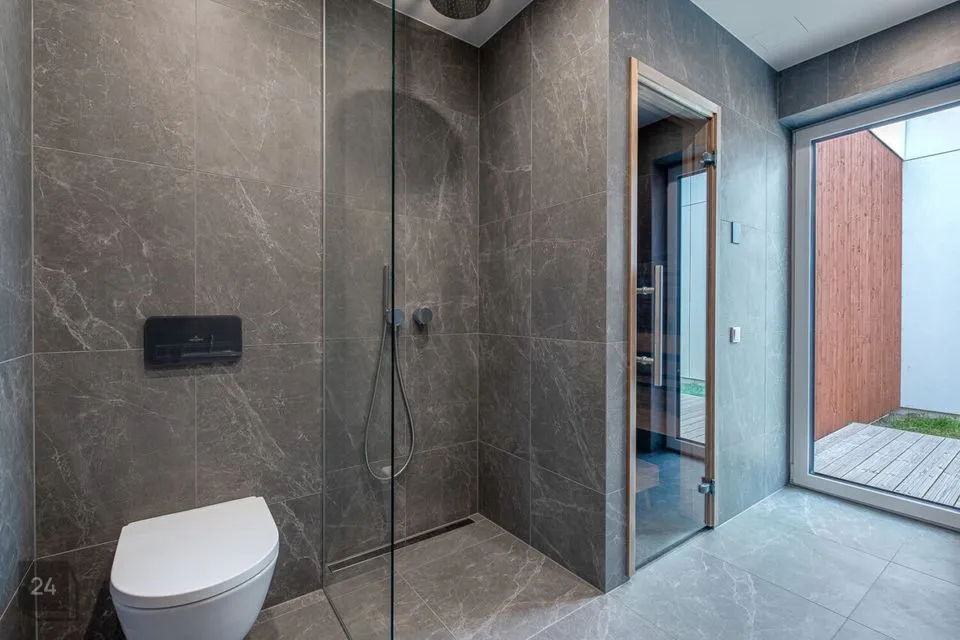 All private houses and terraced houses feature a sauna, utility room, storage area, terraces, at least 2 toilets, high-quality plumbing fixtures, an electric gate with remote control, a stone-paved entrance, and a large enclosed yard with grass. Private house plots are approximately 1500 m2, and terraced house yard areas range from approximately 400 to 1700 m2. The turnkey price includes a home with finishing: floor coverings, plumbing fixtures (sinks, mixers, etc.), a sauna with thermal wood and Harvia heater, and painted interior surfaces.