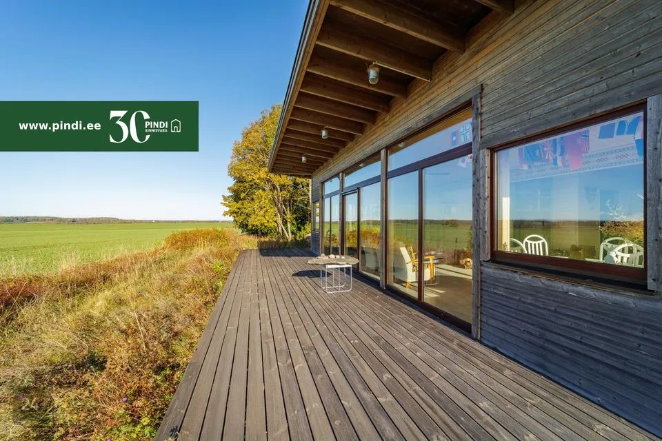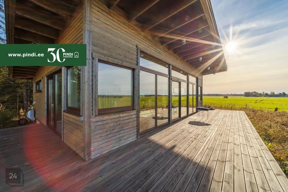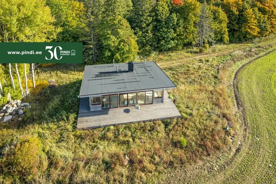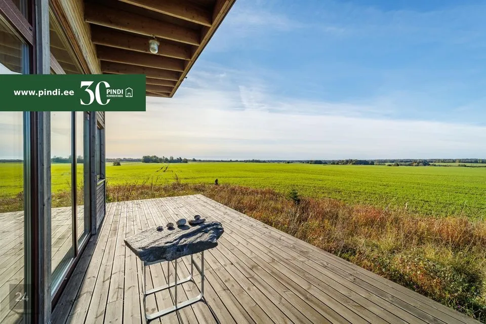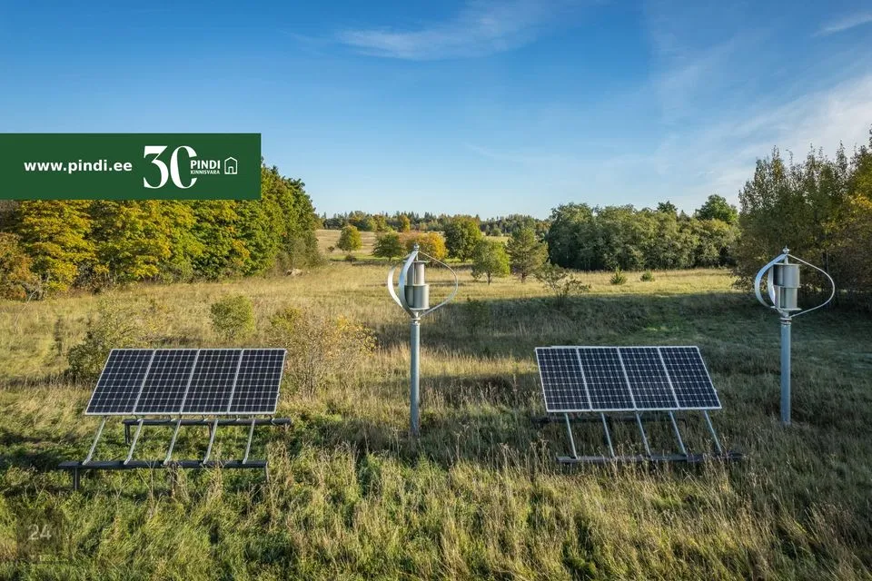 The layout of the cottage is very well thought out. The project was prepared in 2015 by architect Mihkel Urmet. The cottage is located in a unique location — on the top of a hill, on the edge of a field, with a rare 180-degree panoramic view straight to the horizon. The view creates space for both the eye and the mind and makes this place ideal for creative work, brainstorming or just a peaceful recharge. It is a truly green haven — electricity is produced by the sun and wind, and the sewage system is solved with a modern Biorock system. It is well suited for those who value independence, living in the rhythm of nature and drawing inspiration from a clean environment.