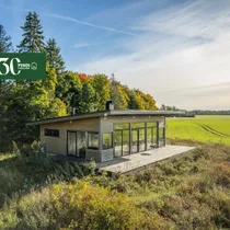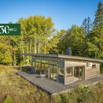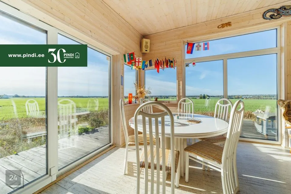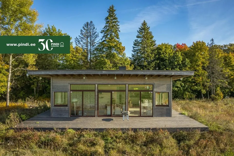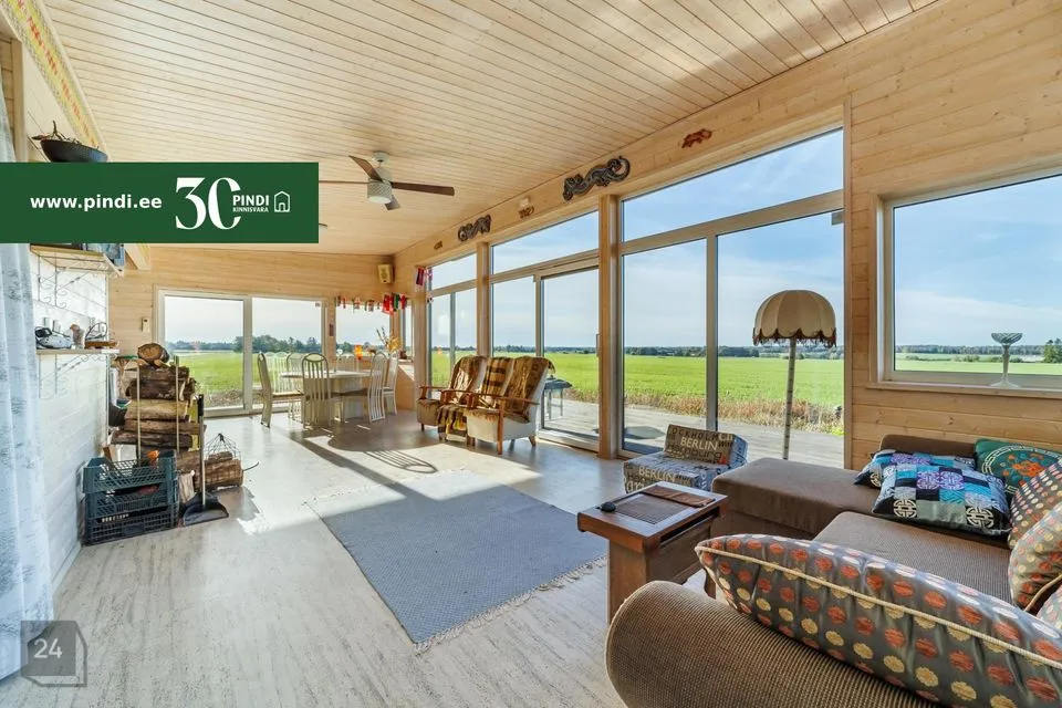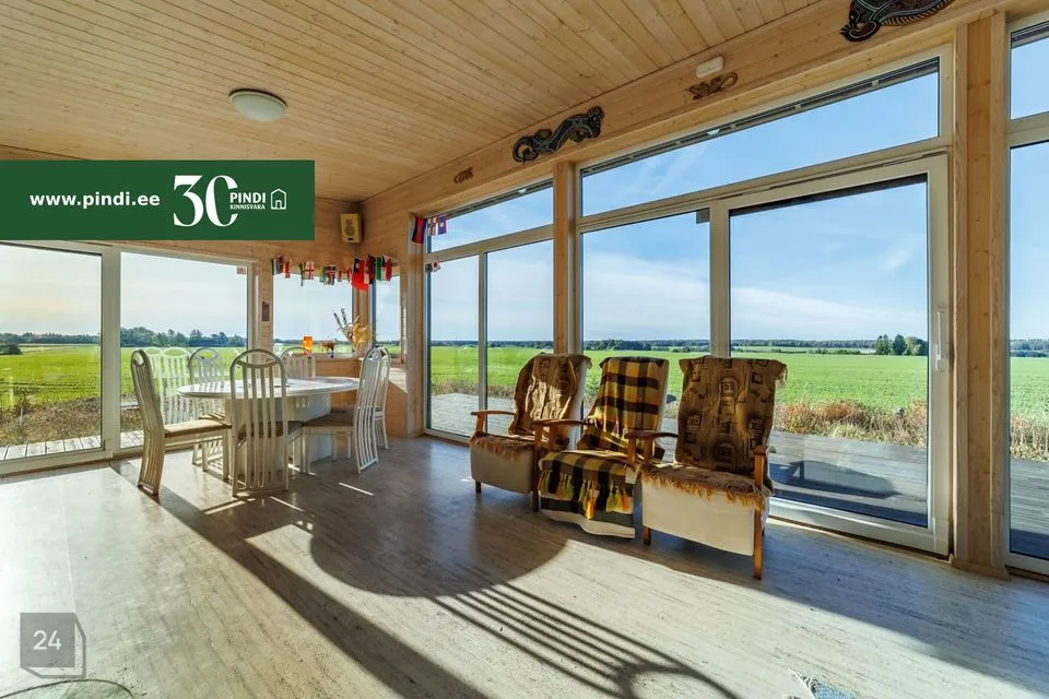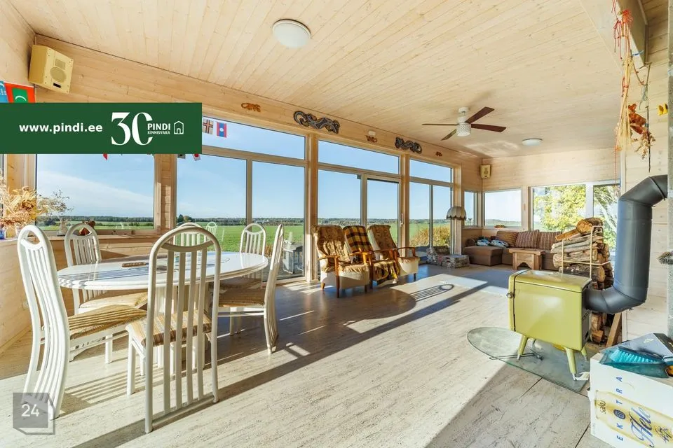 The layout of the cottage is very well thought out. The project was prepared in 2015 by architect Mihkel Urmet. The cottage is located in a unique location — on the top of a hill, on the edge of a field, with a rare 180-degree panoramic view straight to the horizon. The view creates space for both the eye and the mind and makes this place ideal for creative work, brainstorming or just a peaceful recharge. It is a truly green haven — electricity is produced by the sun and wind, and the sewage system is solved with a modern Biorock system. It is well suited for those who value independence, living in the rhythm of nature and drawing inspiration from a clean environment.