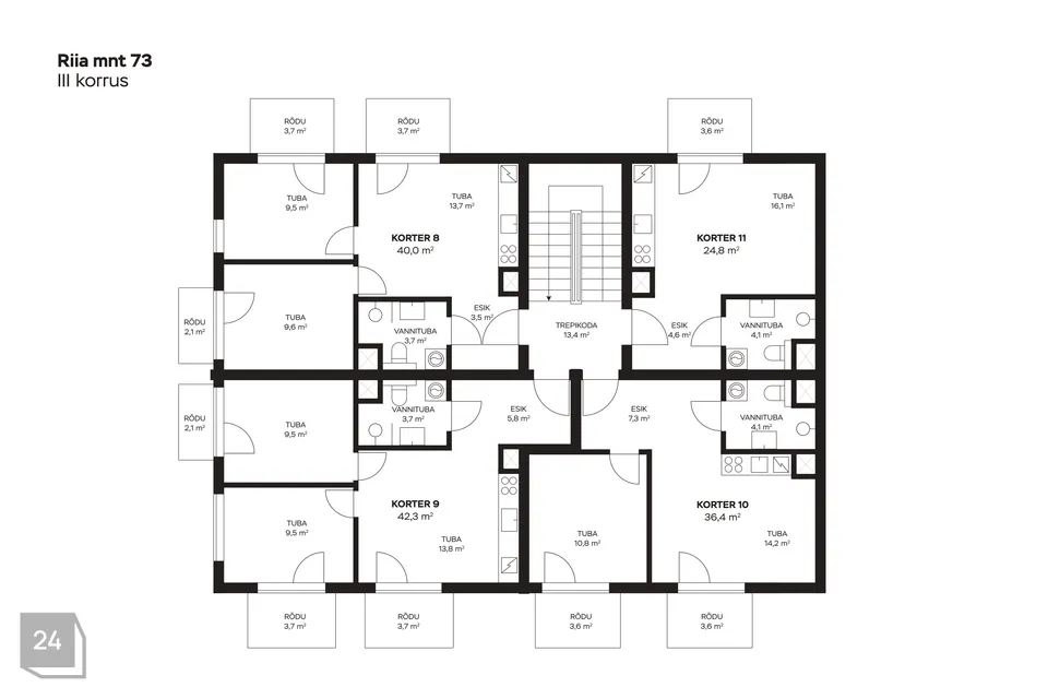 On the first floor, there are 3 service spaces, and on the second and third floors, 8 small tasteful guest apartments. The high ceilings on the third floor make the guest apartments spacious, and floors covered with natural oak parquet bring coziness to them.