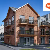 The building is characterized by multi-directional gable roofs with roof extensions, a facade with brick veneer motifs, spacious balconies, and floor-to-ceiling window surfaces.