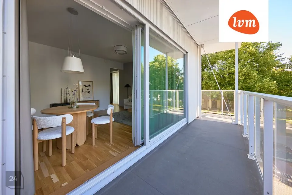 High ceilings, large glass surfaces, spacious balconies opening with sliding doors, tasteful interior design.