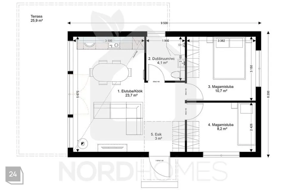 Ruumide planeering on kohandatav ja soovi korral saab majja sisse ehitada sauna.