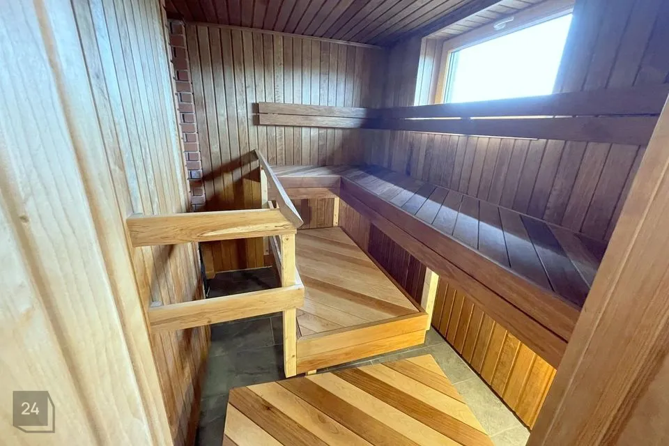 The sauna building is a single wooden building with a pitched roof. The sauna consists of a lounge, a steam room, a washroom, a dressing room and a toilet. In the roofed building, the sauna rooms are covered by a partition, which creates a loft with access from the lounge. Electric underfloor heating in the wet rooms has been added. There is provision for the installation of an air to air type heat pump/conditioner.