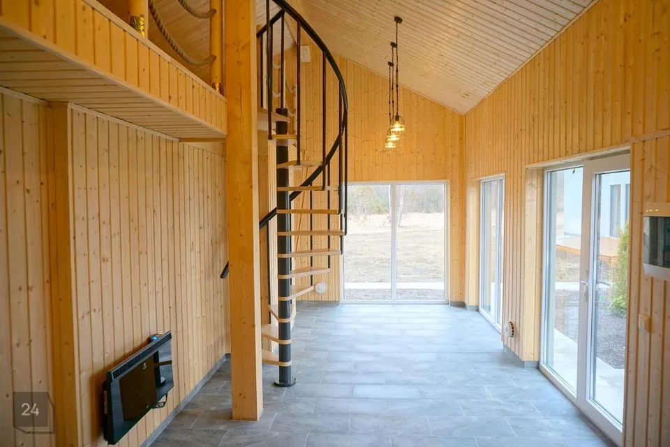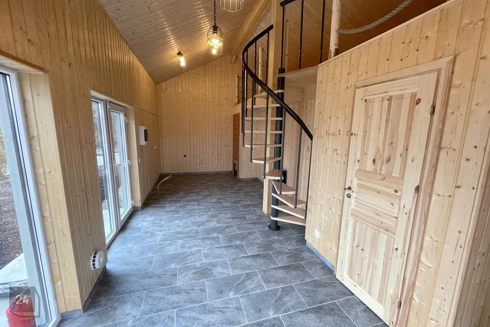 Residential windows -3x with glass in plastic frames, natural wood exterior door, glazed, covered with tinted oil. The exterior walls of the building are finished with painted vertical wood lining. Roofing - steel profile roof (Ruukki classic). Plinth-roofed with Kivex stone block. The energy efficiency figure for a single dwelling is 138 kWh/m2-a, class B. Underfloor heating and hot water production based on air-to-water heat pump. The installed chimney allows the installation of a fireplace on the 1st floor.