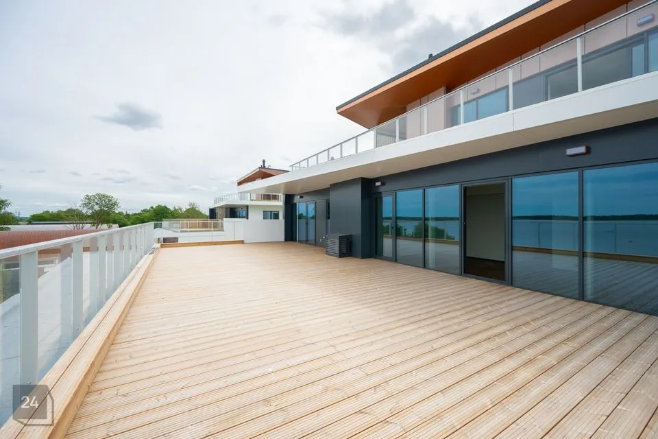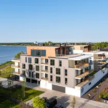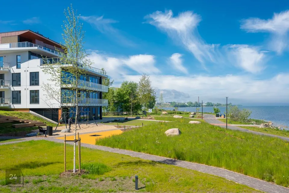 A modern, technically advanced seaside apartment building in North Tallinn. The building borders the sea on one side. Unique.