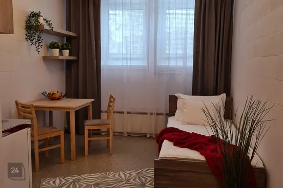 Cozy and practical studio apartment for temporary living for one person.Everything you need for life is immediately available. The kitchen has an electric stove, sink, refrigerator and hood.There is a shower, bathtub and toilet. The room also has a washing machine, large