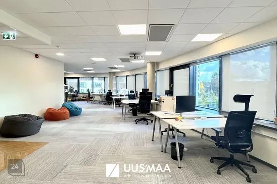 For Rent: Spacious and Bright Office in Energy-Efficient Ovaal House, Located in the Popular Ring Quarter. The space features an open-plan work area, a cabinet, and a meeting room, along with a kitchen-relaxation area, storage room, and toilets.