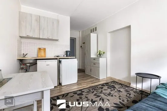 Квартира находится на отремонтированном этаже, очень тёплая, с практичной планировкой и низкими коммунальными платежами. На кухне открытого типа есть небольшой холодильник и стиральная машина.