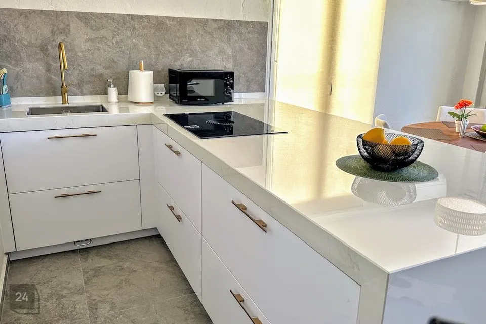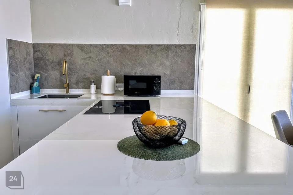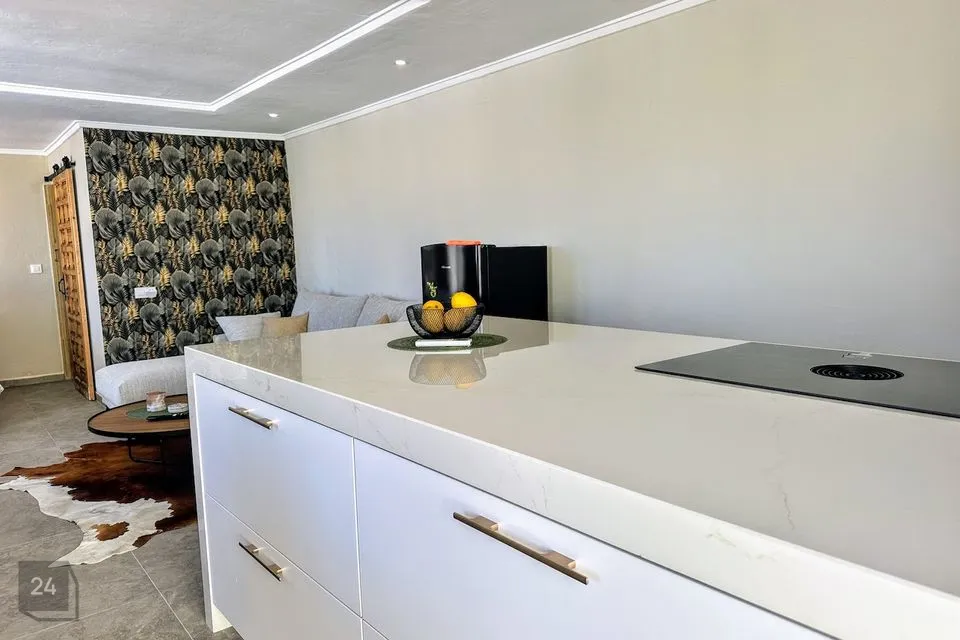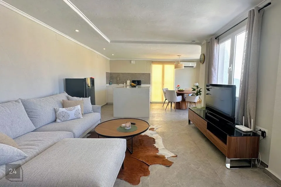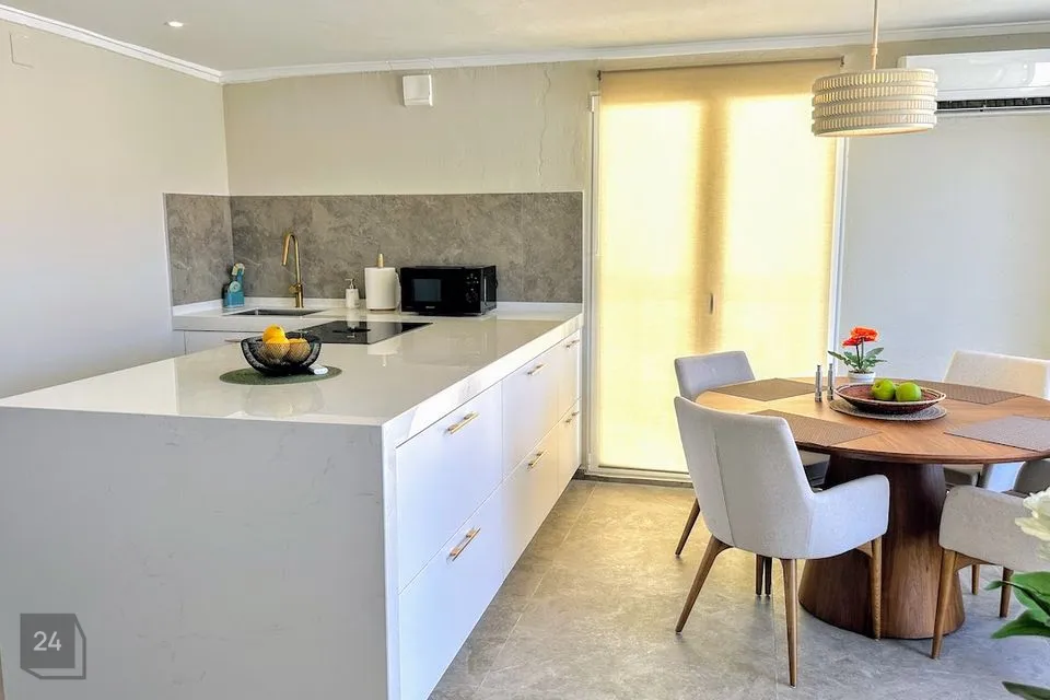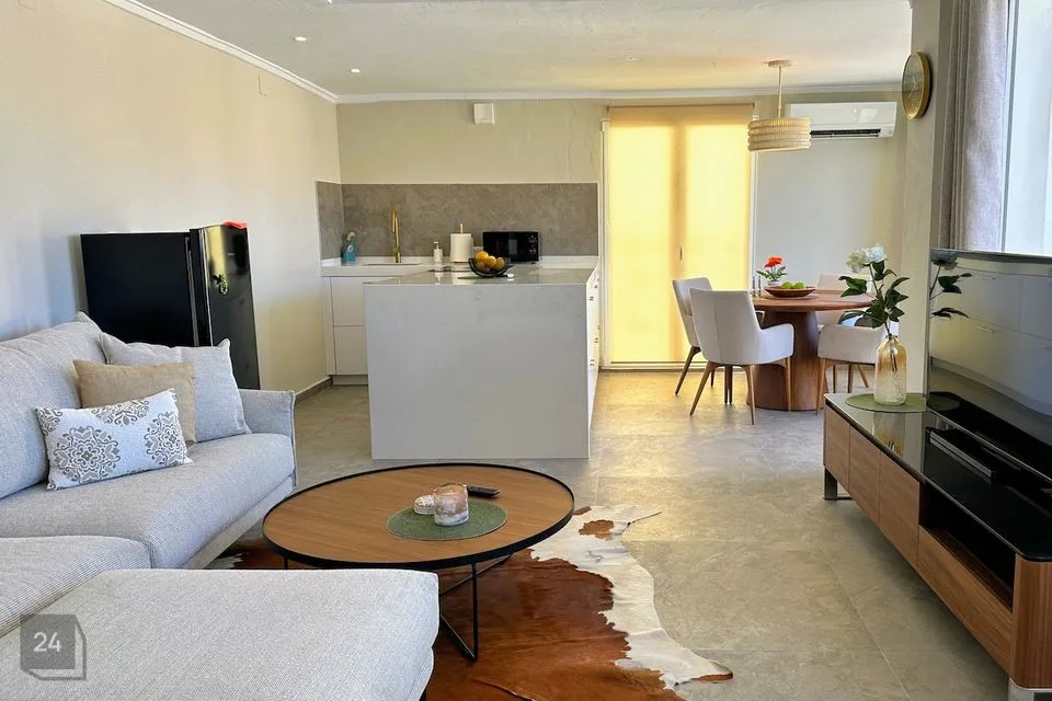 Korter on hiljuti renoveeritud, et luua avar avatud planeering, eemaldades ühe algse magamistoa. Esimesel korrusel on suur terrass panipaigaga. Ülemisel korrusel on kaunilt kujundatud köök suure ja kvaliteetse köögisaarega, söögituba ja elutuba, mis ühendab sujuvalt magamistoa. Kaasaegne vannituba täiendab seda stiilset korterit. Nautige suurepäraseid vaateid merele ja mägedele mugavalt oma kodus. Kogu tehnika ja mööbel on täiesti uus ning korterisse on paigaldatud konditsioneer ja prožektorid.