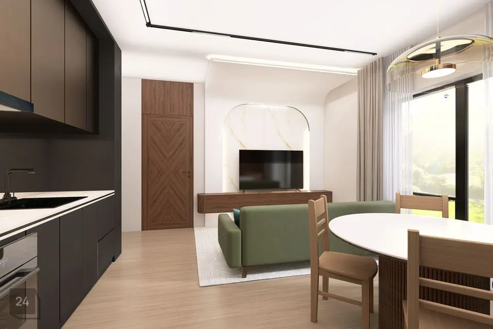 Eluruumide põrandad on kaetud kvaliteetse parketiga, esikus ja sanitaarruumides on kasutatud keraamilisi plaate. Seinad on heledates toonides, mis loovad hubase ja kaasaegse interjööri. Siseuksed on spoonviimistlusega.