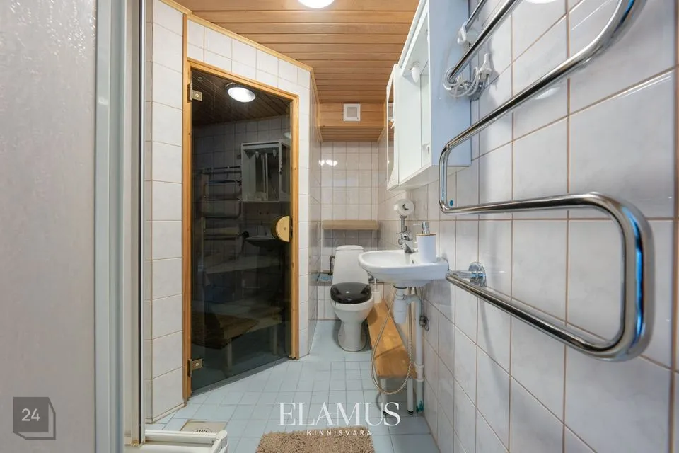 Korteri koosseisus on avar esik, kust pääseb nii saunaga duširuumi ja vetsu, kui ka elutuppa. Elutoast omakorda on pääs kööki, magamistuppa ja kinnisele rõdule.