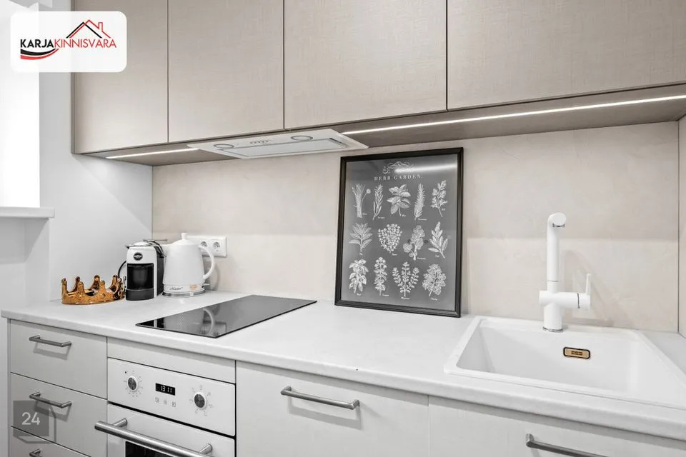 Köögis on uus, eritellimusel valmistatud köögimööbel koos vajaliku tehnikaga – kõik see kuulub hinna sisse.