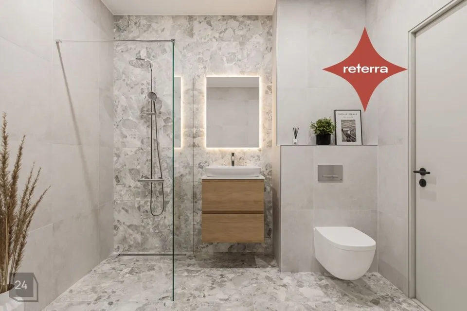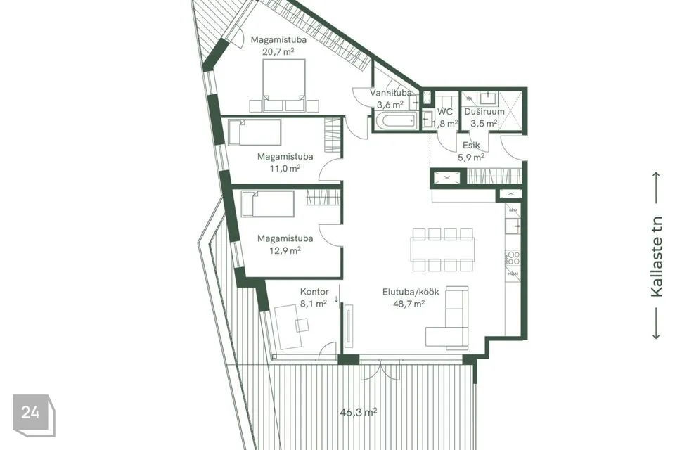 NIMELT SEE KORTER ON KÕIGE LUKSUSLIKUM MEIE PARGIKODU VALIKUST - omades ülisuurt terrassi, eraldi rõdu, kolme tualettruumi ja peaaegu 50 m² suurust elutuba / kööki.