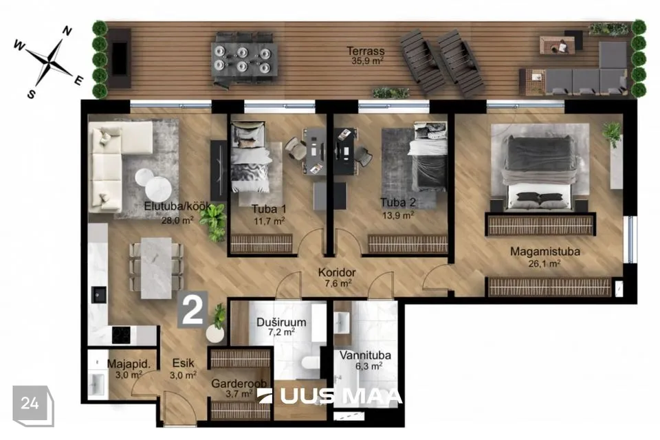 Kogupindala: 146,4 m² millest köetav pind on 110,5 m² ning terass 35,9 m².