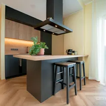 Avatud köök on sisustatud sisseehitatud köögimööbli ja integreeritud köögitehnikaga (külmik, induktsioonpliit, ahi, õhupuhasti). Köögimööbel koos tehnikaga kuulub müügihinna sisse.