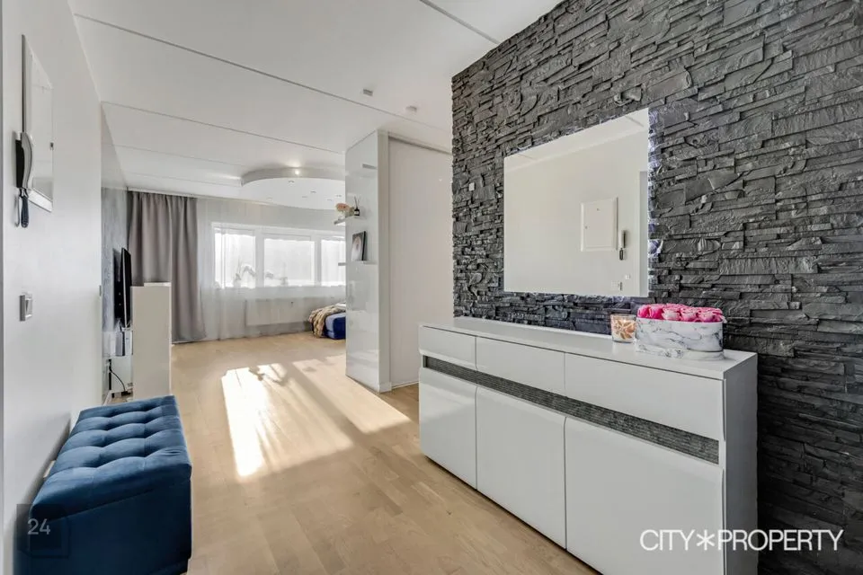 Esikus annab heledate toonide keskel aktsenti tume kivisein. Kodu on hästi hoitud ja heas seisus.