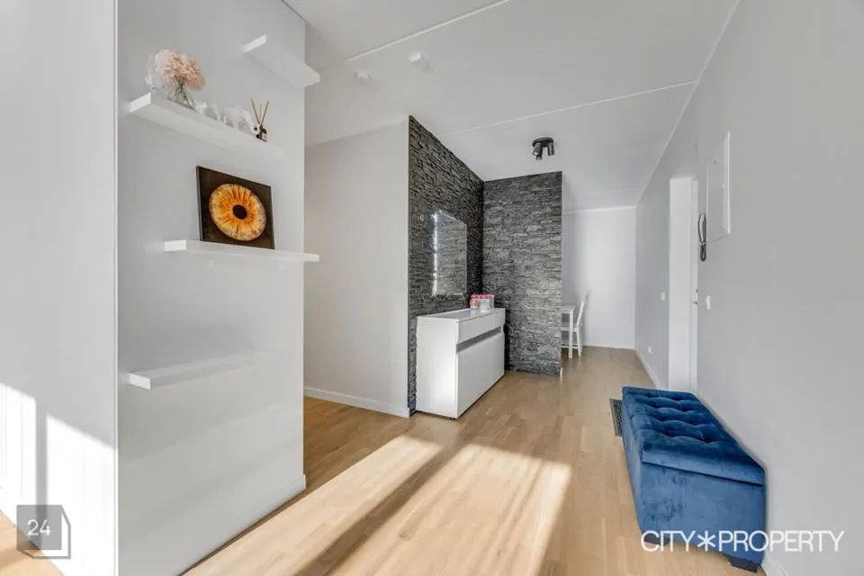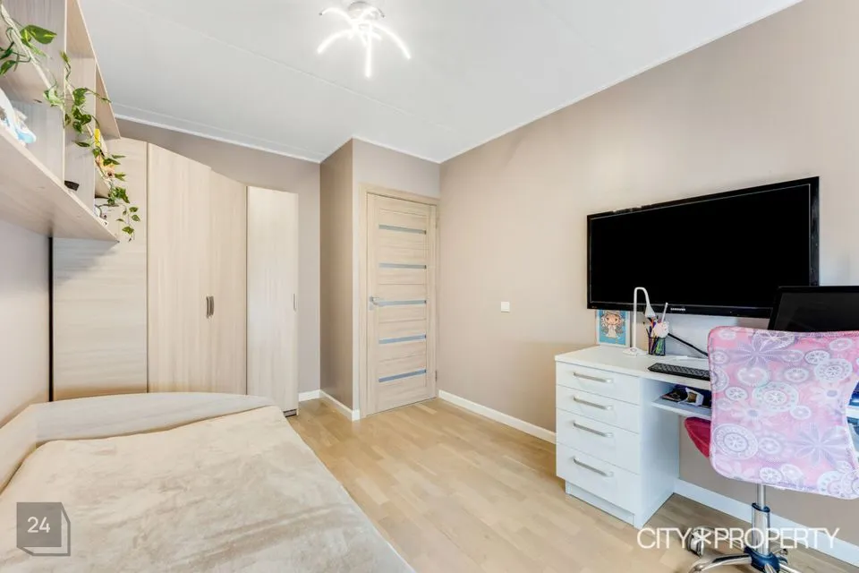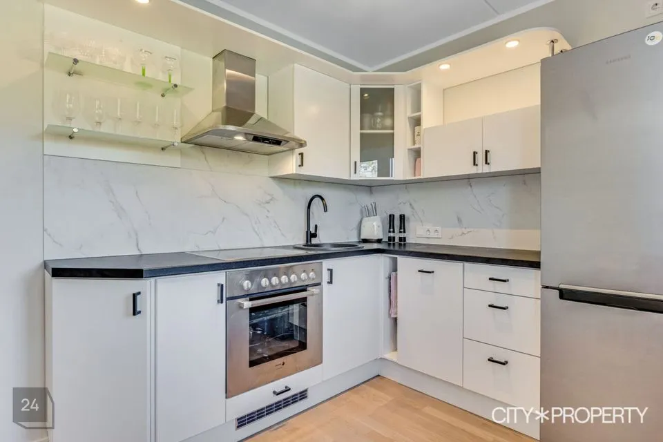 Kodu koosseisu kuuluvad: esik, ruumikas elutuba, kaks eraldi magamistuba, vannituba ja tualett koos ning avar köök pääsuga rõdule. Korter on renoveeritud, siseviimistlus on kaasaegsetes heledates värvitoonides, põrandal hele puitparkett. Vannituba kontrastse tumeda ja puiduse disainiga.