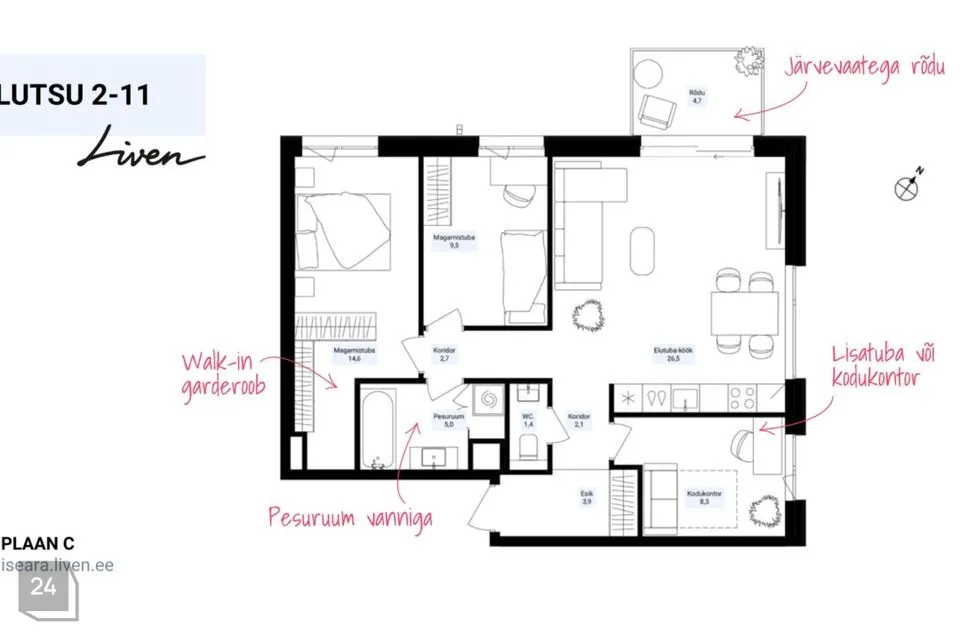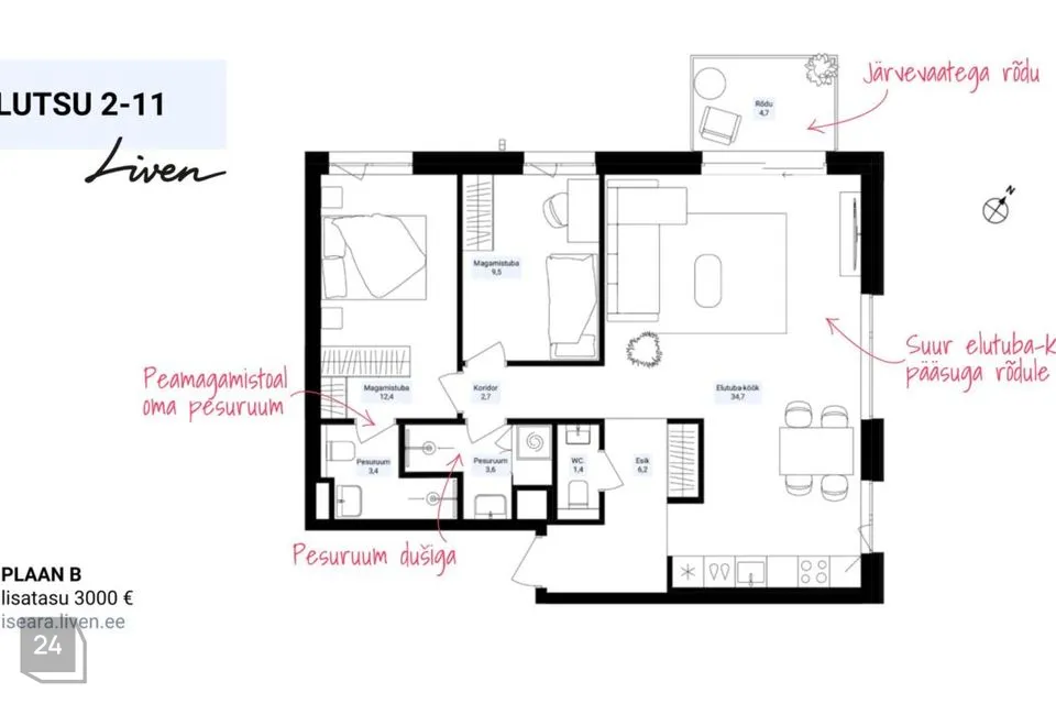 See hubane Iseära kodu asub järvepoolse maja 3. korrusel, kus vaated on mitmesse suunda – nii järvele kui hoovi. Nurgapealne elutuba-köök lükandaknast pääsuga rõdule; 2 või 3 magamistuba; pesuruum duši või vanniga; või soovid peamagamistuppa hoopis walk-in garderoobi või eraldi pesuruumi – valik on Sinu. Iseära kodudes on palju avarust ja valgust, laed on 2,8-meetri kõrgused ning 2,4-meetrised aknad algavad põrandast.