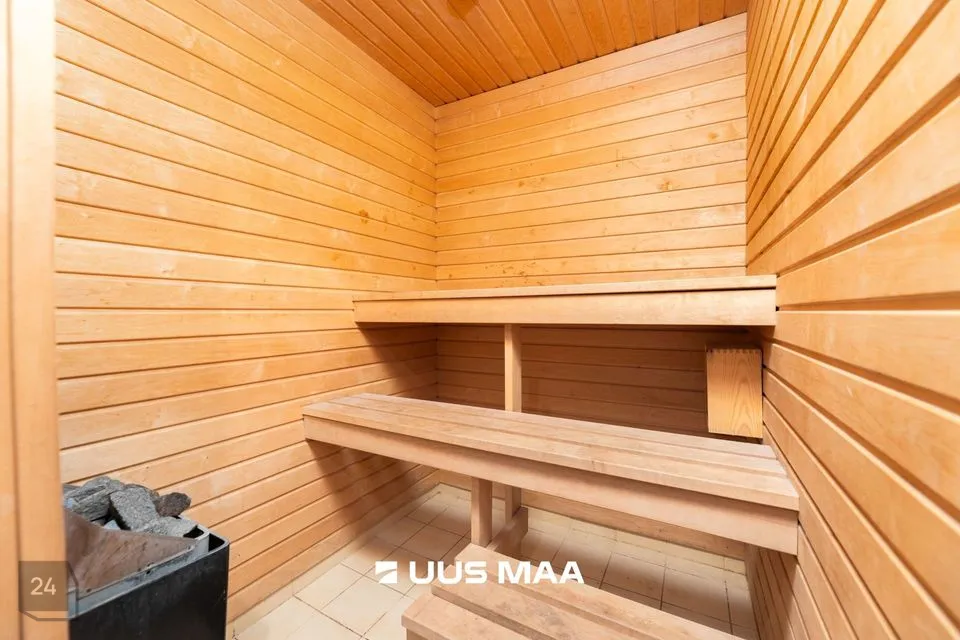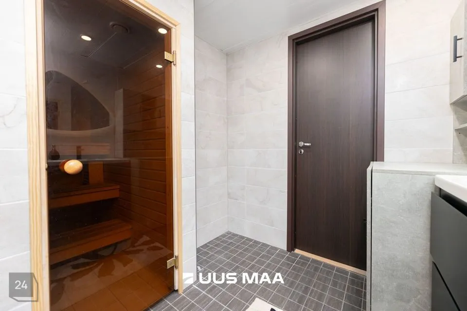 Vannituba ja saun: Vannituba on kaasaegselt renoveeritud, kasutades heledaid seinaplaate ning tumedaid põrandaplaate. Paigaldatud on musta viimistlusega mööbel ja sanitaartehnika, sealhulgas valgustusega peegel ja klaasiga eraldatud dušinurk. Vannitoaga on ühendatud modernne klaasuksega saun, mis pakub mõnusat lõõgastust ilma kodust lahkumata.