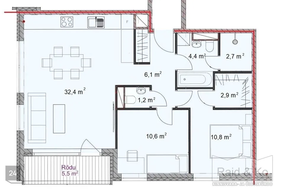 sundventilatsioon. Suletud pind 71,1 m², lisaks rõdu 5,5 m².