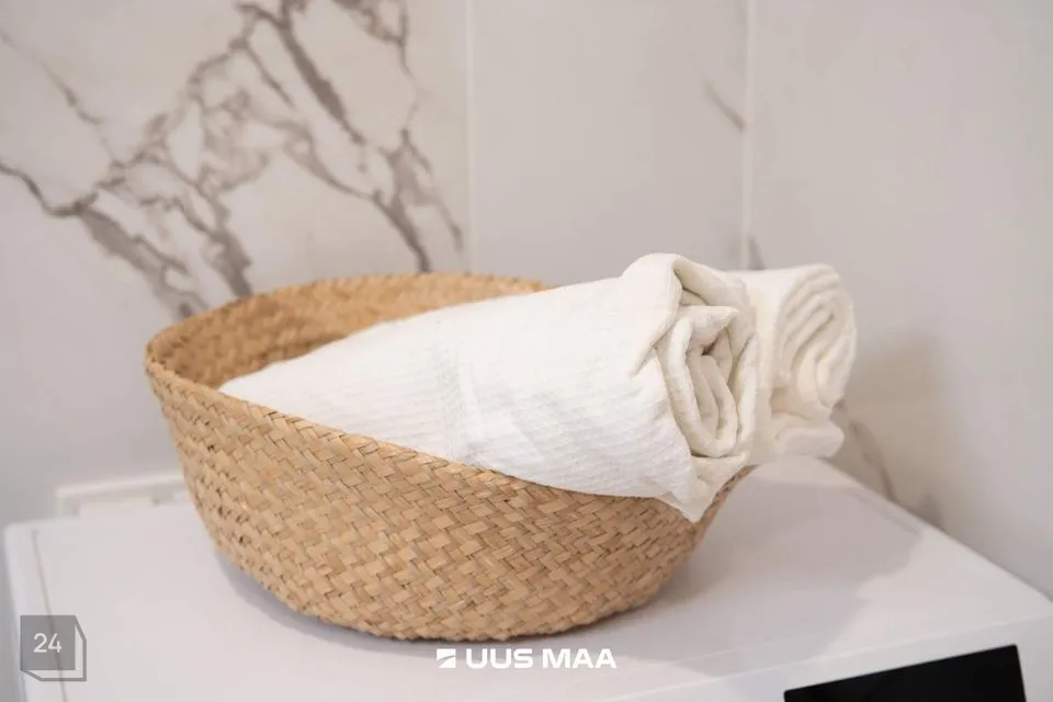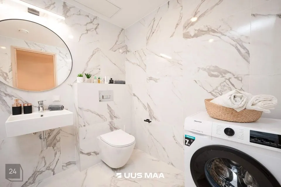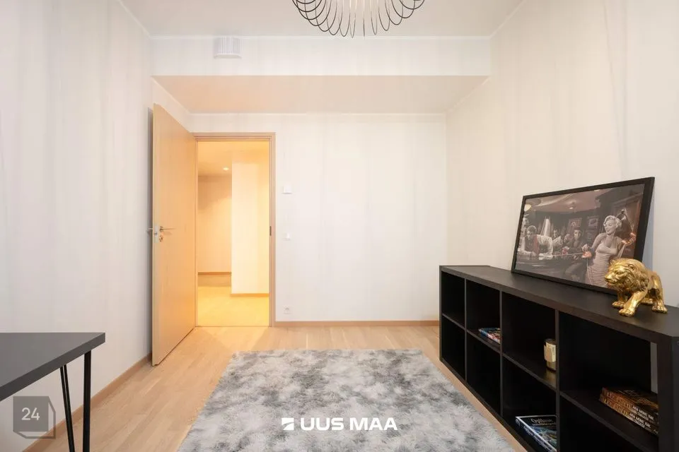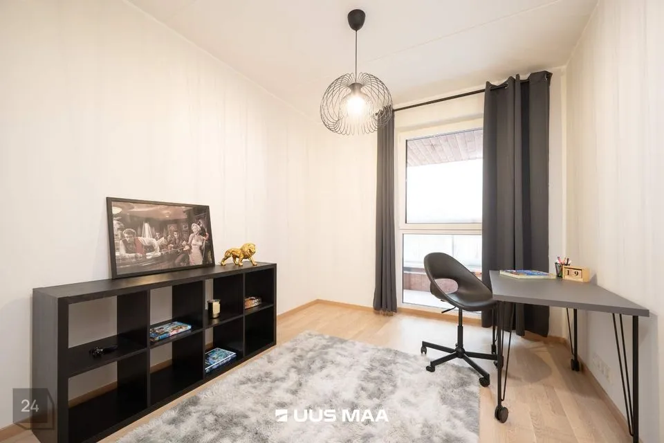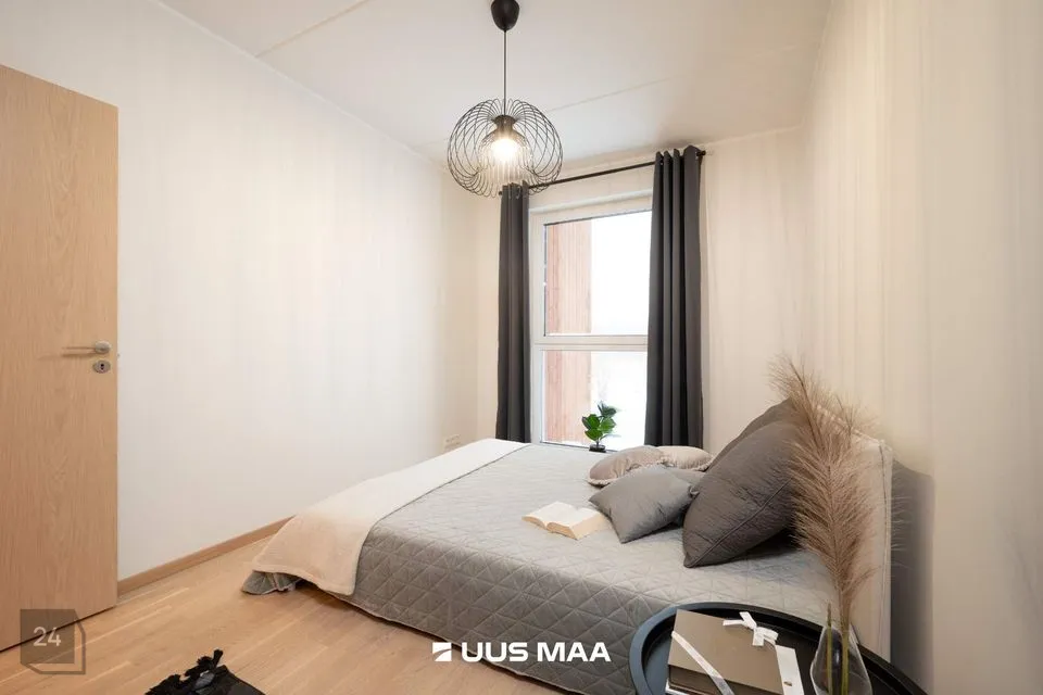 Peamagamistuba on sisustatud avara kapi ja suure maast laeni aknaga, mis toob tuppa ohtralt loomulikku valgust. Teine magamistuba on hetkel sisustatud kontorina, kuid sinna mahub kenasti ka lapsevoodi. Vannituba on täielikult varustatud — seal on nii vann, kraanikauss, WC kui ka pesumasin.
