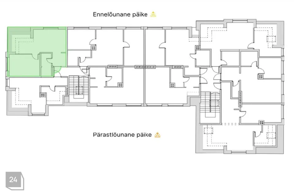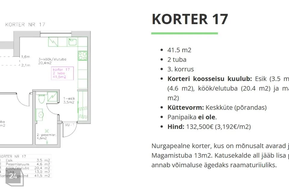 Nurgapealne korter, kus on mõnusalt avarad ja ruumikad toad. Magamistuba 13m2. Katusekalde all jääb lisa põrandapind, mis annab võimaluse ägedaks raamaturiiuliks.