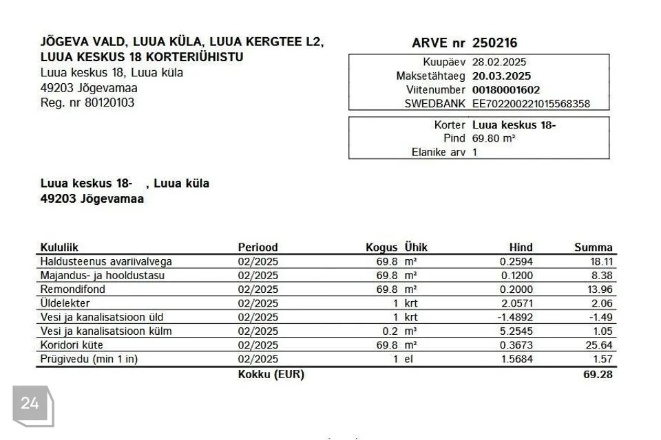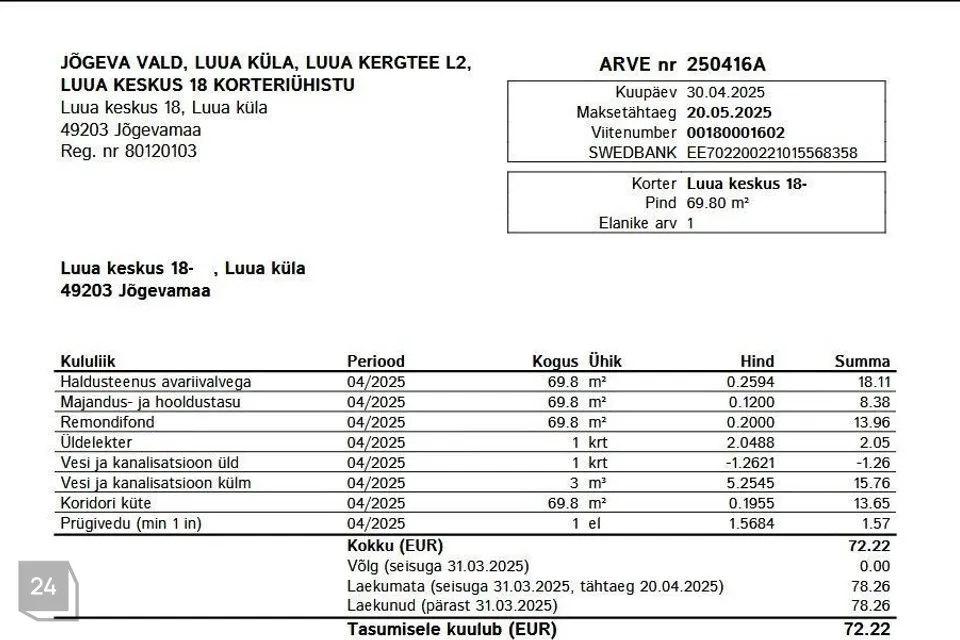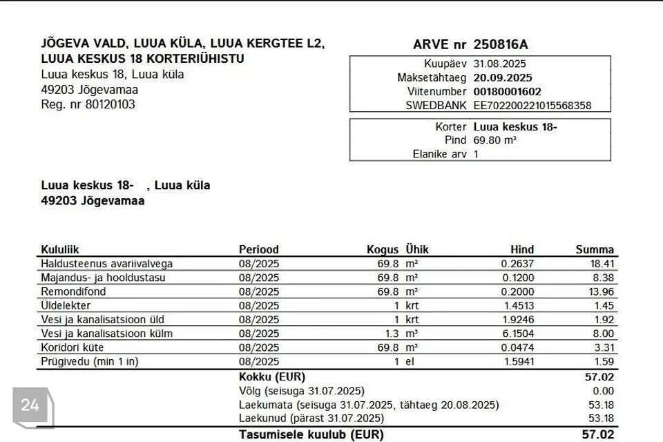 - vesi ja kanalisatsioon 6,1504 eurot/m3