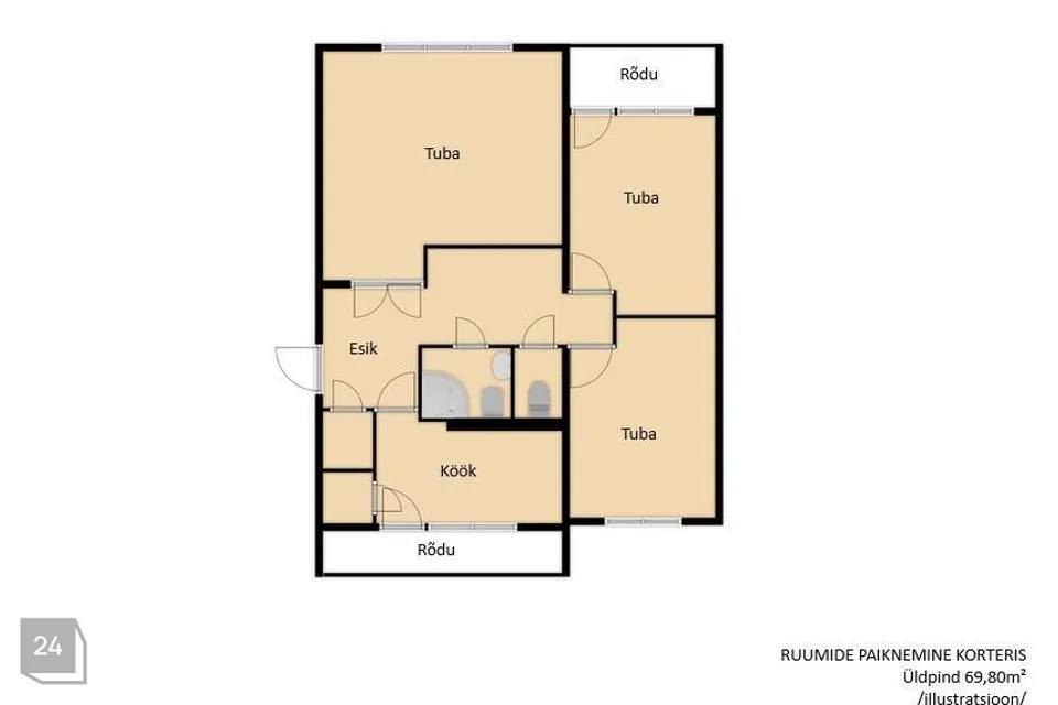 Läbi maja planeeringuga korteril on 2 rõdu, üks vaatega maja ette ja teine tagahoovi roheluse poole.