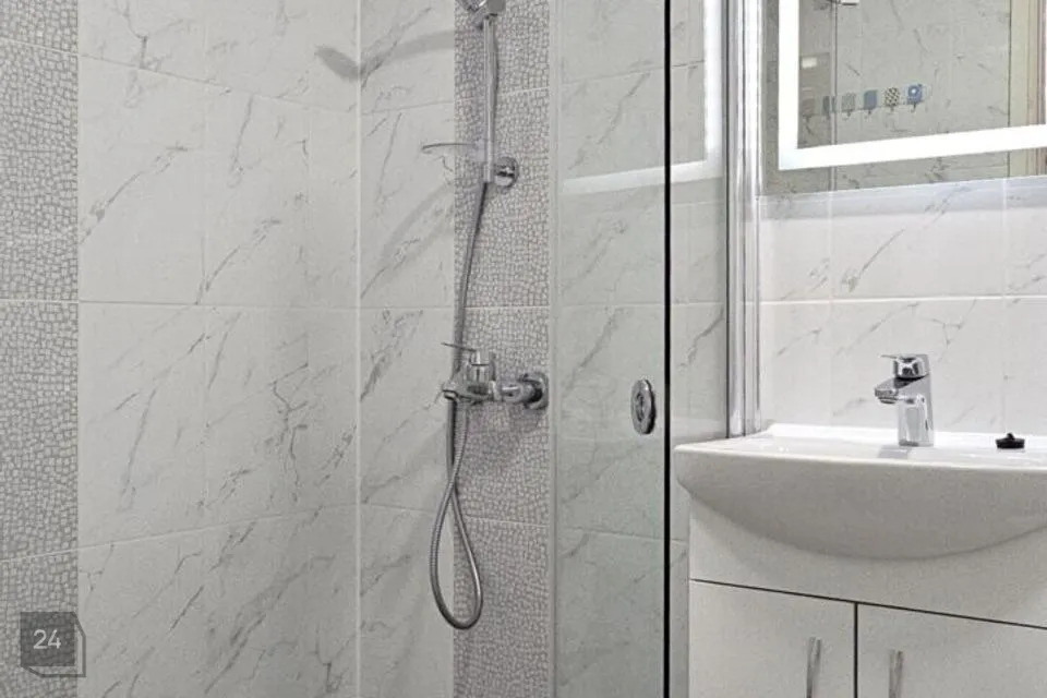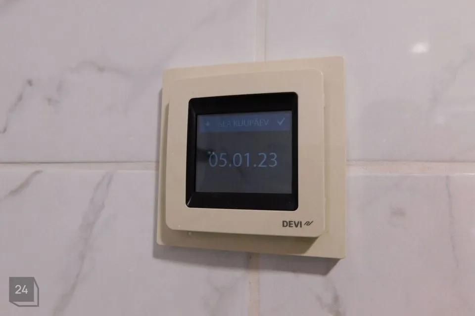* Duširuum-wc on laiendatud ja plaaditud, põrandas on küttekaabel. Temperatuuri saab reguleerida ja seadistada digitaalse termostaadiga nii põranda- kui õhusoojuse järgi. Walk-in dušinurk kokkuvolditava klaasseinaga.