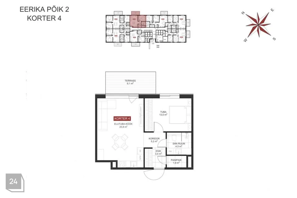 Müüdava korteri üldpindala koosneb suletud netopinnast 51,3 m2, millele lisandub 9,1 m2 suurune terrass. Korteris on esik, elutuba koos köögiga, avar magamistuba, duširuum-wc ja panipaik.