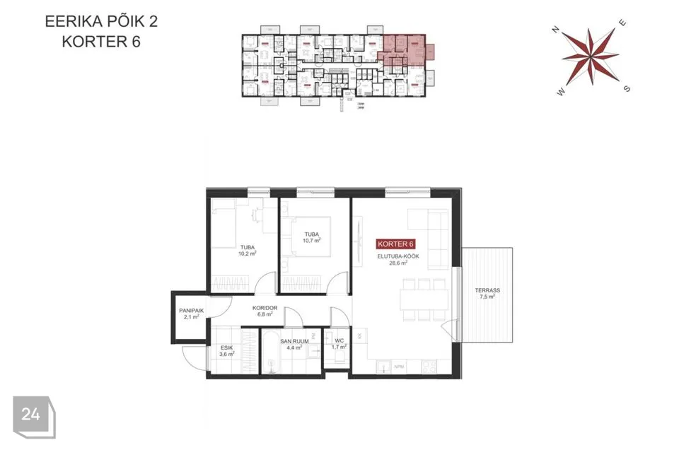 Müüdava korteri üldpindala koosneb suletud netopinnast 68,1 m2, millele lisandub 7,5 m2 suurune terrass. Korteris on esik, elutuba koos köögiga, kaks magamistuba, duširuum-wc, eraldi wc ja panipaik.