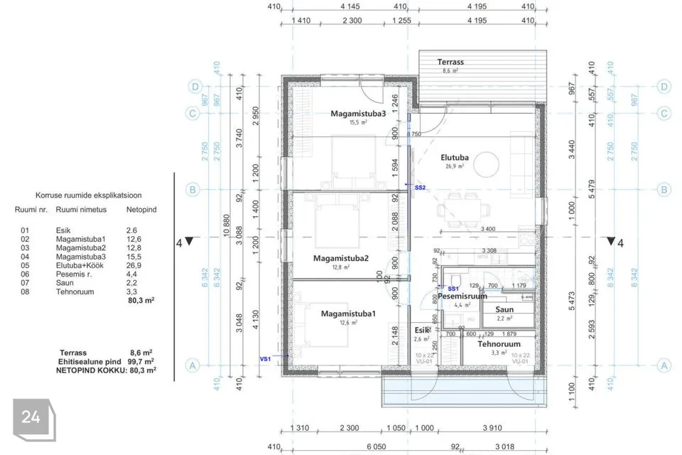 Planeering: esik, wc, saun või vannituba koos pesemisruumiga, kolm või neli magamistuba, avatud köögiga elutuba ja väljast sisenetav tehnoruum - panipaik.
