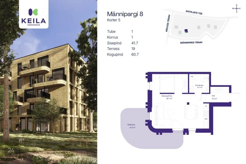 Keila Pargikodud is a new, green-hidden comprehensive A-energy class residential quarter in the heart of Keila. A beautiful pine park under the home windows and nearby are kindergarten, school, grocery store, Keila health trails and everything else needed for life. Spacious, 1 to 5-room apartments with large terraces and balconies, thoughtful parking arrangements and storage rooms.