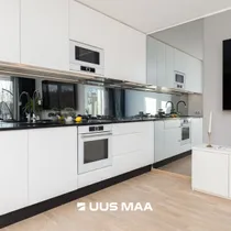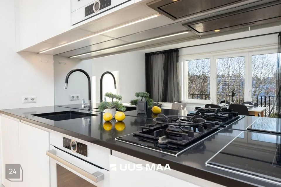 Korteris on eritellimusel valmistatud köök kvartsist töötasapinna, Bosch köögitehnika ja Franke õhupuhastiga.