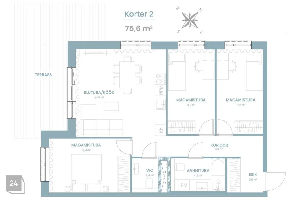 Korteri koosseisus on avar esik, elutuba-köök, 3 magamistuba, vannituba koos wc’ga, külaliste tualettruum ning suur rõdu. Korteri aknad avanevad maja taha ja õhtupäikese poolsele küljele ning terrassil saab nautida päikeseloojangut. Tänu suurtele maast laeni akendele on korterid väga valgusküllased ning suvisel ajal on võimalik oma elutuba terrassi arvelt suurendada.
