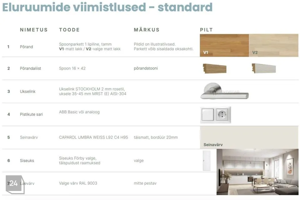 Korterite siseviimistluses on kasutatud heledaid toone, et rõhutada avarust ja valgust. Korterite põrandaid katab 1 lipiline tammeparkett, mis on matt laki või valge matt laki viimistlusega. Tammeparkett on korteris läbivalt igas toas, välja arvatud märgruumides ning esikus. Vastavalt põrandatoonile on kasutuses ka samas toonis liistusid. Vannitubades on kasutatud suuri heledaid keraamilisi plaate, millele on modernsust juurde toodud aktsentseintega. Modernset joont aitavad hoida valged täispuidust raamuksed.