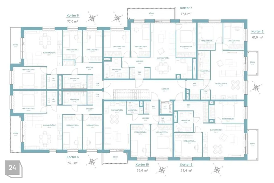 Korterite siseviimistluses on kasutatud heledaid toone, et rõhutada avarust ja valgust. Korterite põrandaid katab 1 lipiline tammeparkett, mis on matt laki või valge matt laki viimistlusega. Tammeparkett on korteris läbivalt igas toas, välja arvatud märgruumides ning esikus. Vastavalt põrandatoonile on kasutuses ka samas toonis liistusid. Vannitubades on kasutatud suuri heledaid keraamilisi plaate, millele on modernsust juurde toodud aktsentseintega. Modernset joont aitavad hoida valged täispuidust raamuksed. Korteri siseviimistluses on võimalik hetkel veel kaasa rääkida ja endale sobivaid valikuid teha.