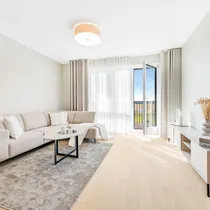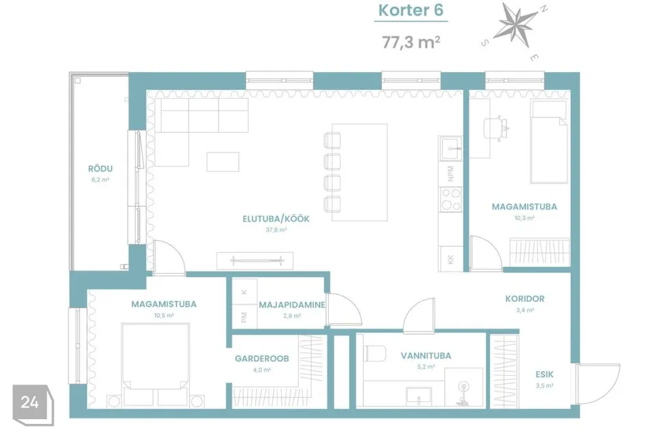Korteri koosseisus on avar esik, 38 m2 elutuba-köök, 2 magamistuba, mille ühe juures on walk-in garderoob, vannituba koos wc’ga, majapidamisruum ning rõdu. Korteri aknad avanevad maja taha ja õhtupäikese poolsele küljele. Tänu suurtele maast laeni akendele on korter väga valgusküllane ning suvisel ajal on võimalik oma elutuba rõdu arvelt suurendada.