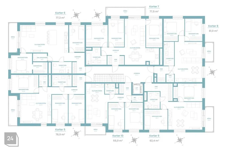 Korterite siseviimistluses on kasutatud heledaid toone, et rõhutada avarust ja valgust. Korterite põrandaid katab 1 lipiline tammeparkett, mis on matt laki või valge matt laki viimistlusega. Tammeparkett on korteris läbivalt igas toas, välja arvatud märgruumides ning esikus. Vastavalt põrandatoonile on kasutuses ka samas toonis liistusid. Vannitubades on kasutatud suuri heledaid keraamilisi plaate, millele on modernsust juurde toodud aktsentseintega. Modernset joont aitavad hoida valged täispuidust raamuksed. Korteri siseviimistluses on võimalik hetkel veel kaasa rääkida ja endale sobivaid valikuid teha.
